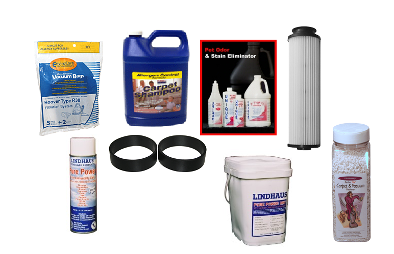 We stock the largest assortment of bags , belts and filters in the Metroplex. If we dont have it they don't make it anymore. When it comes to chemicals for steam vacs and cleaning we offer the best products available such as Lindhaus, Unique, Stainx, Thermax,Hoover and Kirby products.